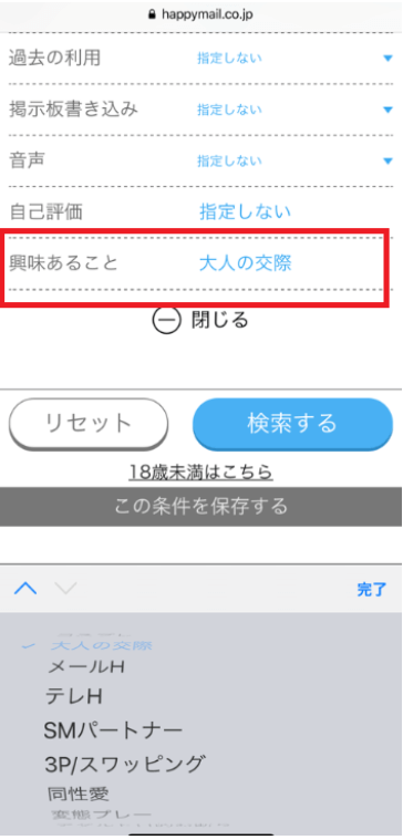また、ハッピーメールのプロフィール検索の詳細設定では、「興味あること」という項目があります↓↓