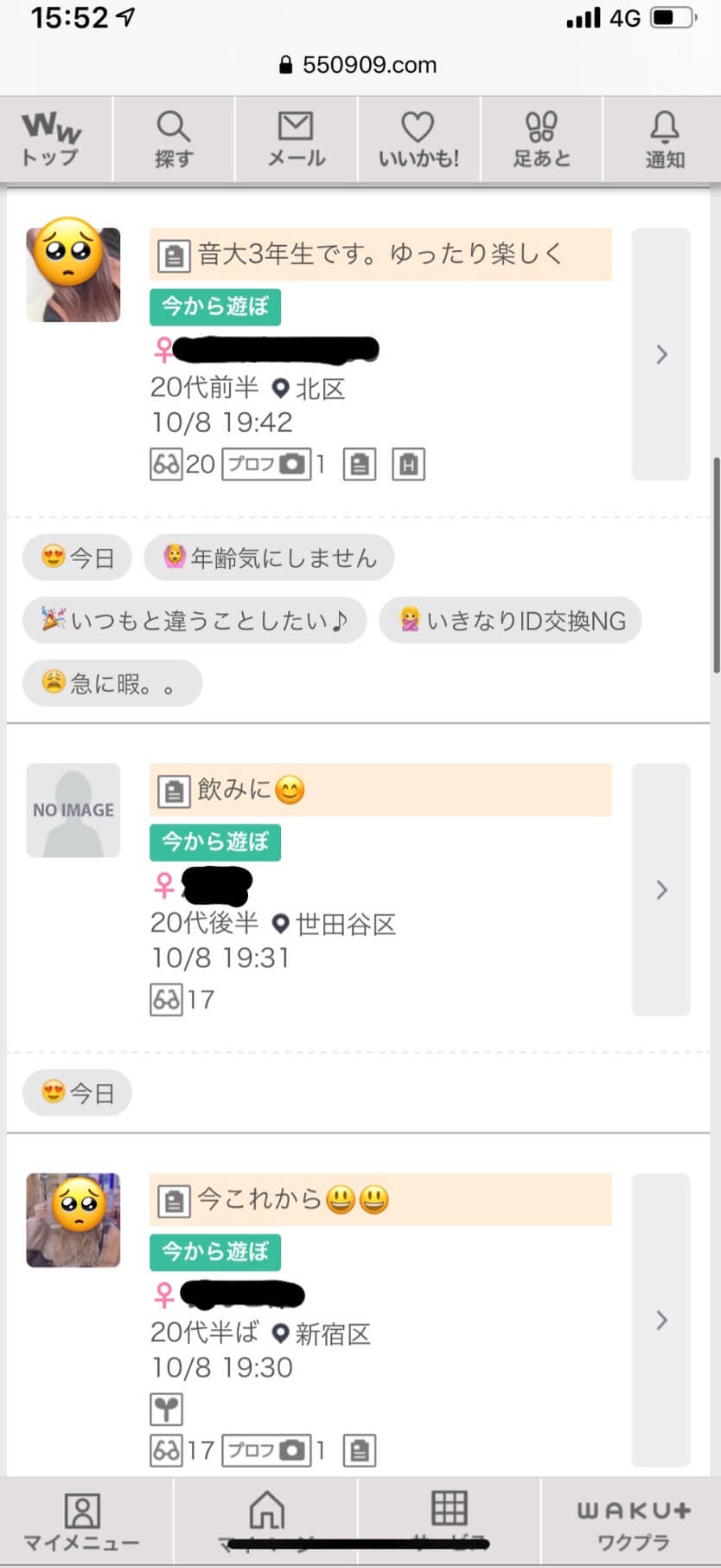 エリアを選択して「今から遊ぼ」をクリックすると、今ヒマしている子が一覧となって表示されます↓↓