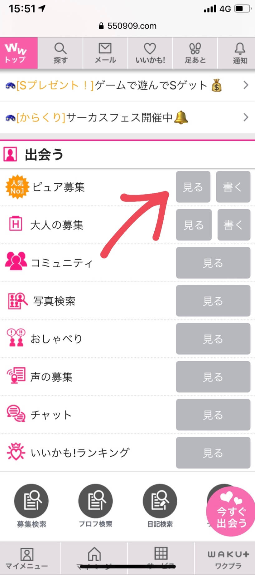 矢印で示した「ピュア募集」をクリックして↓↓